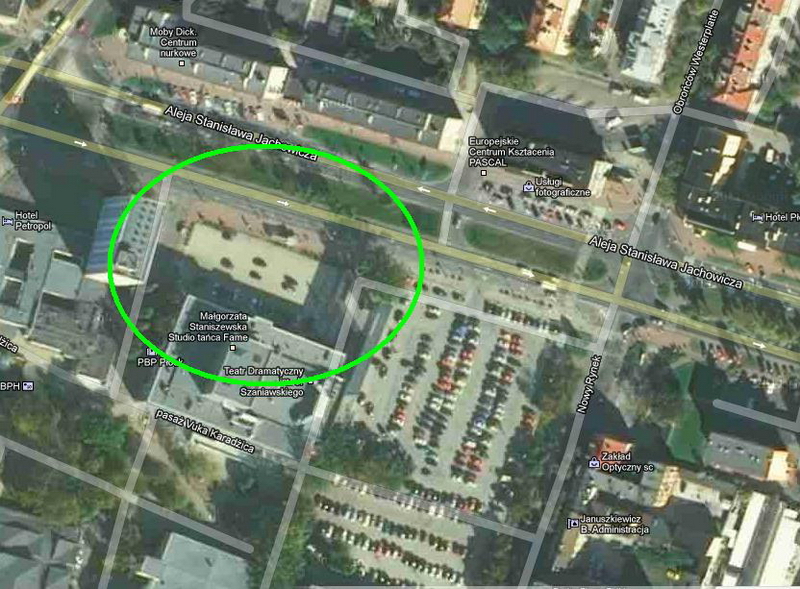 Różowe kółeczko to piękny i czyściutki spory placyk pod Teatrem Dramatycznym. Jak widać 10 metrów od fajnego placu za 2500 :-D