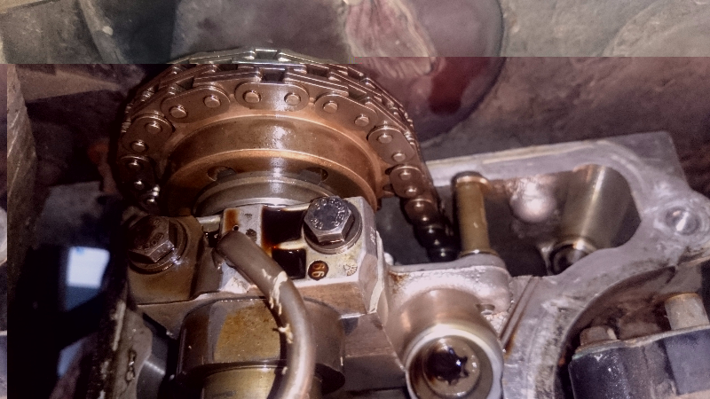 Jeżeli dobrze myślę to rozrząd przestawiony nie jest (taką mam nadzieję i proszę dajcie znać czy tak faktycznie jest) bo po stronie kierowcy znacznik położenia wałka jest ustawiony pod czujnikiem a to chyba świadczy, że jest ok prawda? Skoro tak to by wystarczyło napiąć dobrze łańcuch z urwaną kasetą (ewentualnie jakoś przekręcić prawy wałek - nie wiem jak sprawdzić czy on też jest w prawidłowej pozycji - pomóżcie proszę) żeby wszystko pracowało jak w szwajcarskim zegarku