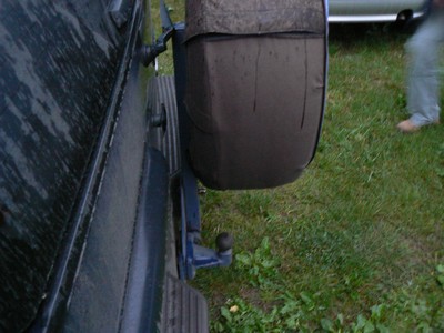 15 ofert kupna od 300 do 500zł na biegu... :) Utwierdziło mnie to w przekonaniu że mój zakup jest wart tych 120zł ;).Tak więc stałem się właścicielem mocowania zapasu do ML'a. Brakuje niestety prawej podpory(nic wielkiego kawał żelaza) oraz gumy z dwoma zaczepami(wchodzą zatrzaskowo w 2 otwory w rurze-podpatrzyłem bo na giełde zajechali ML'em szejkowie naftowi z ukrainy) no i rura na dole lekko skręcona.. Cały interes obraca się w bok na lewą strone,ma jakiś amortyzatorek .Jak bedą miał chwilę to spróbuję coś z tym zmotać choć ze wstępnych pomiarów wynika ,że uchwyt musi być przesuniety bardzo w lewo ,żeby te chromowane pałąki były symetrycznie względem środka klapy.Poza tym wysokość (to czarne na fotkach) to ok 30cm i gdybym chciał bez przeróbek przykręcić do